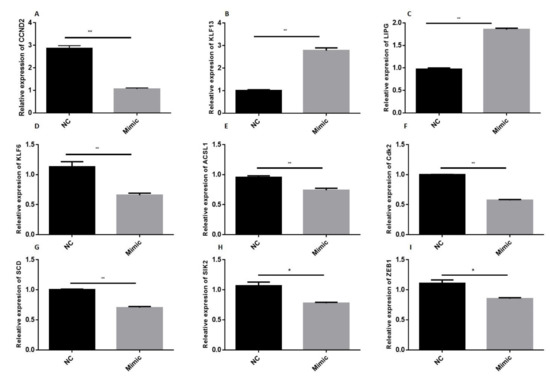 Validation of RNA-Seq data through qRT-PCR. Expression (A–I) relative mRNA levels of CCND2, KLF12, LIPG, KLF6, ACSL1, Cdk2, SCD, SIK2, and ZEB1 in bovine adipocytes transfected with bta-miR-149-5p mimics or mimics negative control (NC). The values exhibit the mean ± SEM (n = 3), and statistical significance is shown by * p < 0.05 and ** p < 0.01.