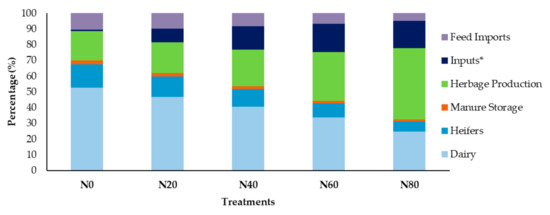 The relative contributions of the different system units to the product CF (%) among the different treatments (N0, N20, N40, N60 and N80). * Inputs (e.g., mineral fertilizer, lime, pesticides and seeds).
