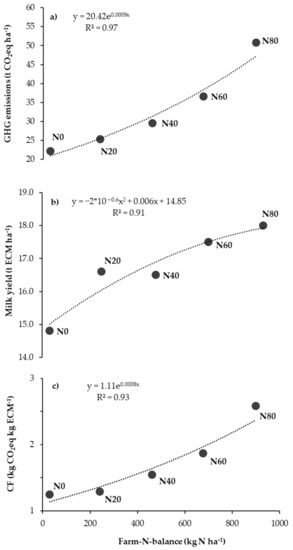 Calculated potential milk yields on the farm, for treatments based on the amount of pasture herbage on offer per hectare, were 14.8, 16.6, 16.5, 17.5 and 18.0 t ECM ha−1 for the 0N, 20N, 40N, 60N and 80N, respectively (Table 3). To achieve this, the land requirement needs to be 1.1, 1.0, 1.0, 0.9 and 0.9 m2 per liter ECM for the various treatments 0N, 20N, 40N, 60N and 80N. With increasing farm-N-balance per hectare, the GHG emissions were generally higher. This relationship could best be described as exponential (Figure 2a). In contrast, the ECM ha−1 correlated linearly with the farm-N-balance (Figure 2b). However, the lowest farm-N-balance (N0 treatment) did not result in the lowest CF (Figure 2c) and were similar between the N0 and N20 treatment.