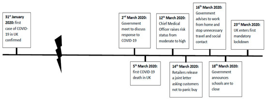 The early days of the COVID-19 pandemic brought times of great uncertainty [1], as well as rapid changes in the advice and guidance received from government and professional bodies as the virus spread. In the UK, life remained much the same as it had previously until late February 2020. As the virus swept across the UK, the public began to receive guidance from the government detailing measures individuals could take to reduce spread (see Figure 1 for a timeline of key events in the UK January to March 2020 relating to COVID-19). On the 23rd March, the UK government announced a mandatory lockdown where the population was informed they must remain at home unless exercising or undertaking essential work or travel [2,3,4]. This was the first time in modern history that the UK population had been subjected to such extreme measures to control a human disease outbreak, and understandably the restrictions adversely impacted everyday life and mental wellbeing [1,3,5,6,7].