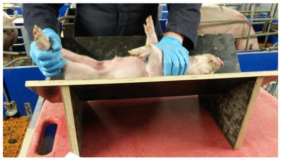 Back Test. On d 13 post-farrowing, each piglet was subjected to a back test as described by [25]. Each piglet was placed on its back on a wooden v-board and restrained for 1 min. The tester held the hind legs with one hand and placed the other gently on the throat (Figure 1). The tester did not change the piglets’ position or move their hands during the 1-min experiment. The piglet was held in this position for 1 min and the number of escape attempts (leg kicks, wriggles) made during this period counted. Each series of wriggles and kicks that was made without pausing was classified as a single escape attempt. The total number of escape attempts was considered the back test score.