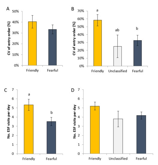The coefficient of variation of the order in which gilts entered the ESF which were (A) consistently friendly or fearful in four human approach tests (PURE gilts) and (B) the same measure for gilts that were either friendly or fearful in at least three out four tests or considered unclassified (two friendly and two fearful outcomes). The number of visits per day to the ESF for (C) PURE gilts and (D) all gilts. a,b indicates a difference at p < 0.05, when Tukey’s adjustment was applied post-hoc.