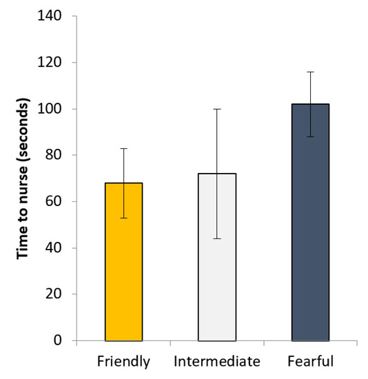 When data from all gilts were analysed, piglets from friendly gilts took less time numerically to touch the tester than the fearful (17.1 ± 2.9 vs. 19.3 ± 2.7 s; p = 0.15), but this was not significant. When data from only PURE gilts were analysed, there was a tendency for piglets from friendly gilts to take less time, even given the smaller sample size (friendly = 12.8 ± 2.9 vs. fearful = 16.8 ± 2.3 s; p = 0.08).