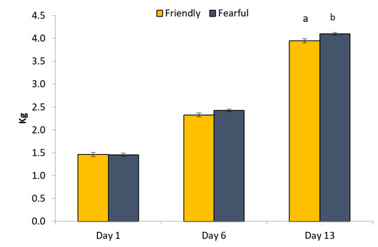 There was no effect of gilt profile on piglet birthweight, whether only PURE or all gilts were included. Across all gilts, piglets weighed approximately 1.32 ± 0.34 kg (mean ± std. dev.) at birth. When all piglets were included in the analysis, there was no effect of gilt profile on the piglets’ growth to weaning or weaning weight. However, when only piglets from the PURE gilts were included, piglets from fearful gilts tended to be heavier than the friendly (p = 0.05), and there also tended to be an interaction between profile type and weighing data (p = 0.07). Indeed, on day 13 after birth, piglets from the fearful gilts tended to be heavier than those from the friendly ones (p = 0.06; Figure 5). However, weaning weight did not differ for piglets from sows of divergent profiles. All piglets were weaned at approximately 7.02 ± 1.53 kg.