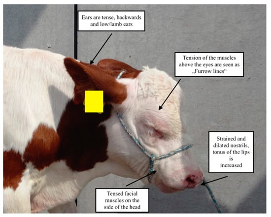 The facial expression should always be evaluated when the animal is undisturbed [6,54]. If animals are not used to handling, responses to human approach will be affected, therefore reducing the sensitivity of the facial grimace scale. Also, disease patterns, prevalence of acute or chronic pain, and age might influence the sensitivity and specificity of the bovine pain face [6].