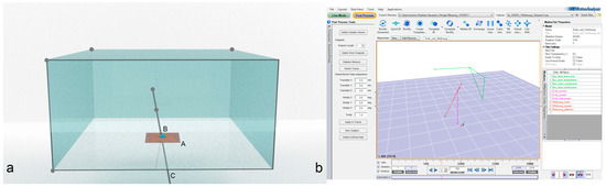(a) Schematic drawing of the experimental setup. The artificial skin (A) holding the different ports (B) was mounted at the bottom of a clear acrylic box. A 10-mm endoscope (C) was inserted, and the maximal possible movement was recorded by 18 motion capture cameras. The positions of the reflective markers are shown as grey dots. (b) A picture of the recorded data recorded by the motion capture cameras.