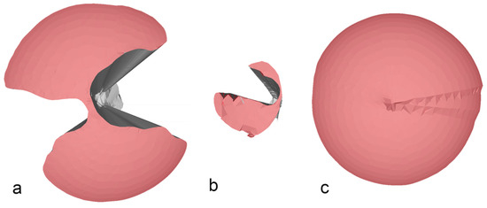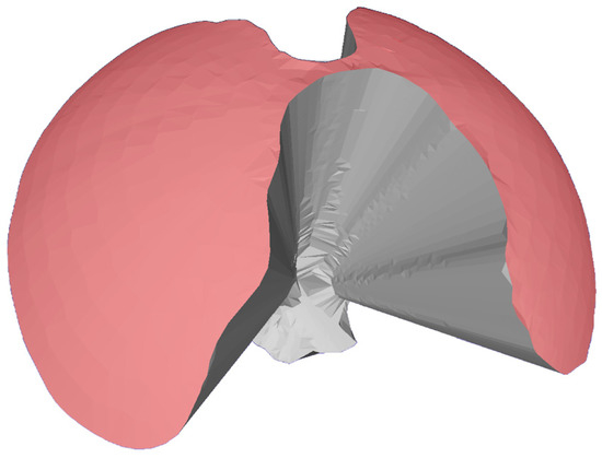 A rendered image from MESHLAB was used to manually select the upper area (red) to calculate the area of maneuverability. The example shows the measured volume of one SILS-port with both the endoscope and the instrument inserted. The image was rendered in Blender (www.blender.org, accessed on 30 April 2018).