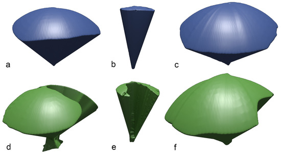 Example of rendered images of the volume of maneuverability (VoM). The upper line shows the VoM when only an endoscope was inserted into the ports. The lower row shows VoM when an endoscope and an instrument are inserted into the ports. (a,d) SILS-port; (b,e) Endocone; (c,f) glove port. The images were rendered in Blender (www.blender.org, accessed on 30 April 2018).