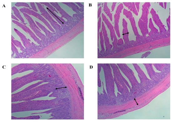 Intestine morphometric measurements (A). Villus height, (B). Villus width, (C). Crypt depth, (D). Mucosal depth. Bar: 100 µm.
