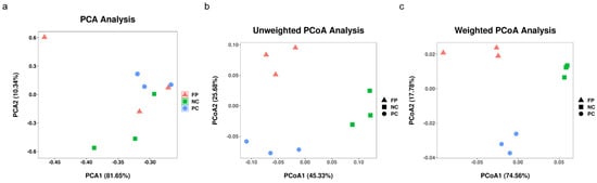 Advanced analysis of the bacterial communities of cecal digesta. (a) Principal component analysis of the cecal digesta of basal diet without treatment (NC), basal diet plus coccidial challenge (PC), and basal diet plus the coccidial challenge and 1 g/kg of B. licheniformis-fermented products (FP) (n = 3). Principal coordinate analysis of quantitative traits (unweighted UniFrac distances) (b) and qualitative traits (weighted UniFrac distances) (c) of the cecal bacterial communities from NC, PC, and BLFP (n = 3).