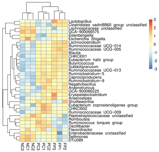 Taxonomic composition analysis of cecal digesta. A heatmap showing the dominant 35 genera (y-axis) across different treatment groups (x-axis, basal diet without treatment (NC), basal diet plus coccidial challenge (PC), and basal diet plus the coccidial challenge and 1 g/kg of B. licheniformis-fermented products (FP), n = 3).