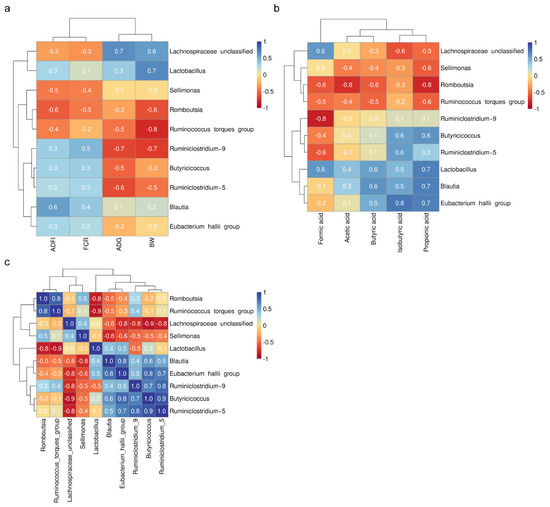 Pearson’s correlation analysis. (a) The correlation coefficient between the dominant 10 genera and cecal short-chain fatty acid. (b) The correlation coefficient between the dominant 10 genera and growth performance of broilers. ADFI: average daily feed intake, FCR: feed conversion ratio, ADG: average daily gain, BW: body weight. (c) The correlation coefficient among the dominant 10 genera. The positive correlations are shown in blue, while the negative correlations are shown in red. The color intensity and the size of the circle are proportional to the correlation coefficients. The values from +1 to −1 indicate the strength of the association.