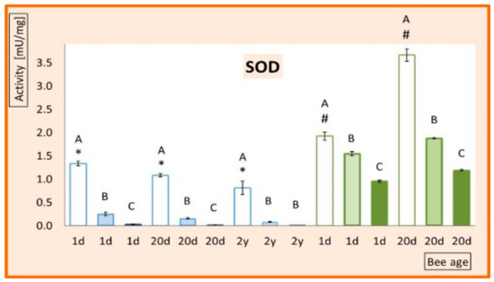 Mean activities of superoxide dismutase (SOD). The error bars indicate SD. Bee diet (group) contains 0 ppm (I-0), 5 ppm (I-5), and 200 ppm (I-200) imidacloprid. 1-day-old bees (1d), 20-day-old bees (20d), and 2-year-old bees (2y); queens (blue bars); workers (green bars); bee diet contains 0 ppm (transparent bars), 5 ppm (light-shadowed bars), and 200 ppm (dark-shadowed bars) of imidacloprid. Different capital letters indicate that differences between the means (diets) nested within a particular age and caste are significant (ANOVA + LSD; p < 0.01). Values marked with hash differ significantly from each other. Values marked with asterisk differ significantly from one another.