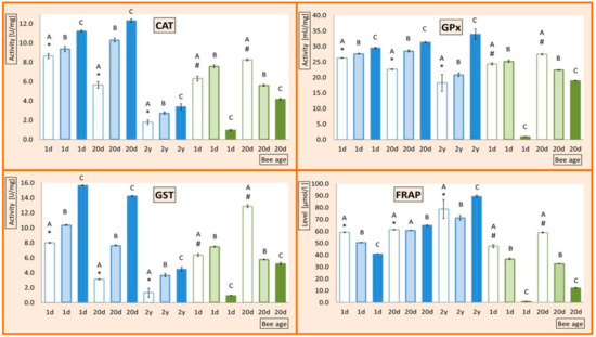 Mean activities (mean ± SD) of catalase (CAT), glutathione peroxidase (GPx), glutathione S-transferase (GST), and the level of the ferric reducing total antioxidant potential (FRAP). Error bars indicate SD. 1-day-old bees (1d), 20-day-old bees (20d), and 2-year-old bees (2y); queens (blue bars); workers (green bars); bee diet contains 0 ppm (transparent bars), 5 ppm (light-shadowed bars), and 200 ppm (dark-shadowed bars) imidacloprid. Different capital letters indicate that differences between the means (diets) nested within a particular age and caste are significant (ANOVA + LSD; p < 0.01). Values marked with # differ significantly from each other. Values marked with asterisk differ significantly from each other.