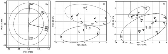 Principal component analysis (PCA): (A) two-dimensional projection catalase (CAT), glutathione peroxidase (GPx), glutathione S-transferase (GST), superoxide dismutase (SOD), and ferric reducing antioxidant potential (FRAP) in the principal components PC1 and PC2; (B) projection of workers (w; solid) and queens (q; dotted) in the principial components PC1 and PC2; (C) two-dimensional projection of the age classes (dotted–2-year-old; queens only, solid–1-day-old and 20-day-old insects in the principal components PC1 and PC2 planes.