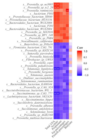 3.5. Correlation among Ruminal Microbiome, Ruminal Fermentation, and Milk Components