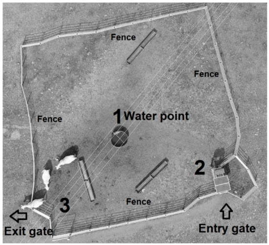 Aerial photo (drone) showing the setup of the walk-over-weighing system. Numbers indicate (1) water point; (2) walk-over-weighing scale deployed at the entry gate; and (3) exit gate. Both entry and exit gates enabled cattle to walk through the unidirectional spear gates to access the water trough.