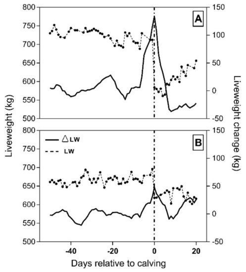 Liveweight (connected dots) and liveweight change over 7 days (solid line) for a cow experiencing high weight loss (A) and low weight loss (B) at calving. A single dot represents the daily averaged LW for both cows. Calving (dashed vertical reference line) occurred for (A) on 29 August 2017 when ∆LWC peaked at 112.90 kg and for (B) on 20 August 2017 when ∆LWC peaked at 60.43 kg.