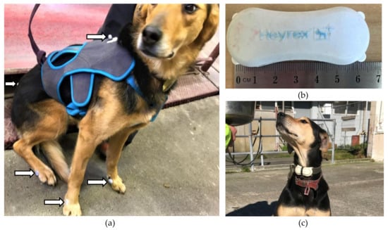 On the day of data capture, all dogs were fitted with the same adjustable safety harness, an accelerometer was attached to their collar, and retroreflective markers were placed on the dog (see video analysis for more detail), as shown in