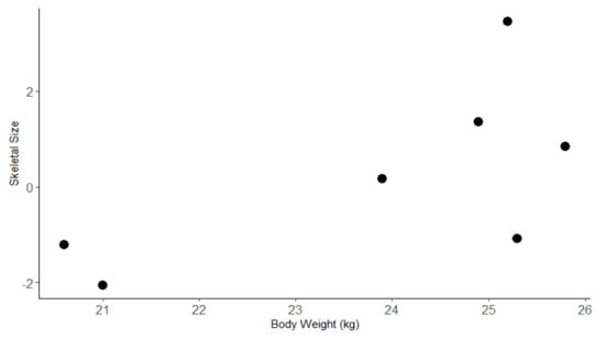 Table 1). The factor loadings from the first principle component for each skeletal measure were used to generate the singular variable for each dog (“skeletal size”), which is considered to account for the majority of variation between the measurements. For a full description of the approach, the reader is referred to the paper by Leung et al. [