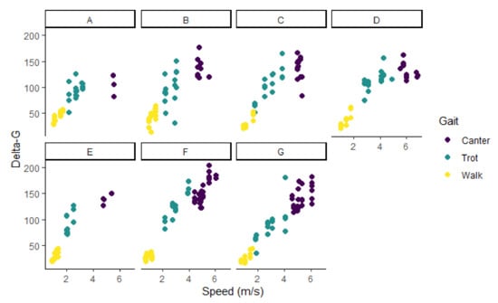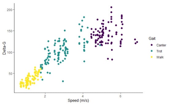 As stated previously, there was a division in the delta-G-speed curves that corresponded to the change in gait between walking and trotting, but not between trotting and cantering. The interquartile range of delta-G for the walking intervals (min: 14.23, LQ: 23.59, median: 29.5, mean: 33.71, UQ: 42.32, max: 64.42) did not overlap with the trotting/cantering IQR (min: 31.70, LQ: 97.42, median: 122.10, mean: 119.86, UQ: 139.85, max: 205.00). In contrast, there was significant overlap between the delta-G values for dogs while trotting and cantering, which led to the binary categorisation of BGV, rather than a tertiary categorisation of their actual gait.