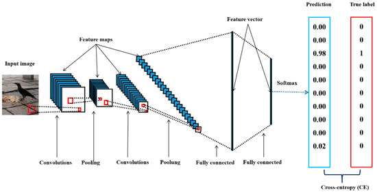 Deep convolutional neural networks are very similar to artificial neural networks (ANNs) [40], which are composed of large numbers of neurons with learnable weights and biases. Typically, these neurons are aggregated into layers. A typical DCNN consists of a sequence of layers, and every layer of the network transforms one volume of activations into another through an activation function. Three main types of layers (convolutional layers, pooling layers, and fully connected layers) are used to build DCNN architectures. Note that convolutional layers and fully connected layers contain learnable parameters (the weights and biases of the neurons). For image classification tasks, during the training phase, when a DCNN receives input data, it produces a prediction through forward propagation [15]. The prediction is usually interpreted as the probability distribution of the categories predicted by the model, and a higher value in the probability distribution usually indicates that the DCNN is more confident that the image belongs to the corresponding category (Figure 2). The distance between the predicted probability distribution and the one-hot encoding-based [41] representation of the data label is recorded as a loss. Then, the network adjusts its parameters through backpropagation [15] to minimize this loss. Backpropagation is usually implemented by the gradient descent method [15].