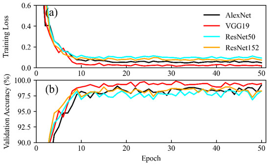 In our experiment, during the training phase, the proposed models tended to converge in approximately 20 epochs, and the verification accuracy of each model also tended to stabilize, which indicates that each network was fully trained (Figure 4).
