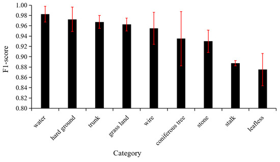 The F1-score of each habitat factor is greater than 0.80 (Figure 5, Table A1), which indicates that the models exhibited good performance on the test set. There were significant differences (analysis of variance (ANOVA) p < 0.05, Table A2) in the abilities of the models to identify various habitat elements on the test set. This significance is mainly reflected in the fact that the average F1 scores of “leafless” and “stalk” were significantly lower than those of other categories (Table A3), and there were no significant differences for the other habitat elements.