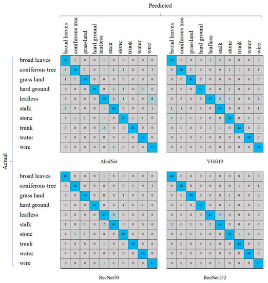 Confusion matrix (or error matrix) comparison among the above models. Taking the confusion matrix of AlexNet as an example, I and J represent the row number and column number of the elements in the matrix, respectively; then, the element (i, j) of each confusion matrix represents the number of predictions of category j given that the actual label was class i, with i and j referring to the classes from the category names at the left and top of the figure. Note that AlexNet recognized “leafless” as “wire” most times, while the other three networks did not. However, the other three networks confused “leafless” and “stalk” with each other.