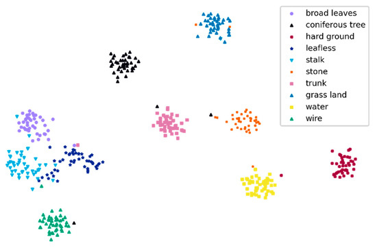 T-distributed stochastic neighbour embedding (T-SNE) [64] visualization of the last hidden layer representations produced by ResNet152 for ten habitat element classes (the coloured point clouds represent the different habitat element categories, showing how the algorithm clustered these categories). Most habitat elements were grouped independently according to their categories, but broad-leaved trees, leafless plants, and stalk were more concentrated, and wires were closer to these three categories.