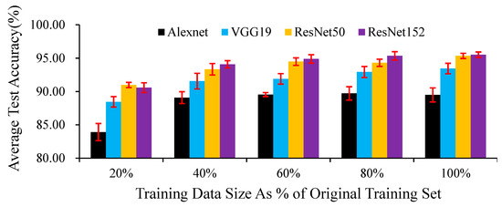Average test accuracies of the proposed models trained with training sizes ranging from 20% to 100% of the images in the original training set. Error bars displaying the standard deviations within 50 epochs are shown.