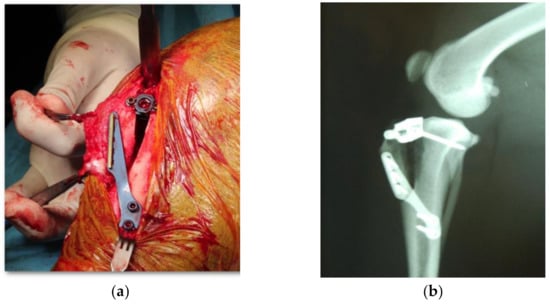 Surgery: At V1, all patients underwent surgery on the CCL injury under general anesthesia, adapting the anesthesia protocol to the patient’s clinical conditions. Arthrotomy was performed on all patients to assess the state of the meniscus, recording the presence or absence of injury as well as the performance or not of a meniscectomy. All patients subsequently underwent TTA surgery, according to the technique described by Montavon et al. (2004) [] (Figure 1a). A radiological study was performed post-surgery to verify the correct placement of the implants (Figure 1b). Medical treatment for all patients was as follows: 22 mg/kg intraoperative amoxicillin-clavulanic acid (Amoxicilina/Ácido Clavulánico, Normon S.A., Madrid, Spain); 0.1 mg/kg meloxicam (Metacam, Boehringer Ingelheim GmbH, Ingelheim am Reim, Germany) every 24 h for 7 days; and 0.006 mg/kg buprenorphine (Buprex, Quintiles SL, Valencia, Spain) every 8 h for 3 days.