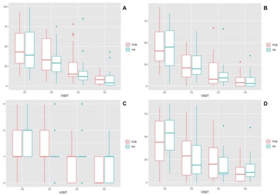 Comparison between the studied variables (VASC, VASD, EPCOJ, EVAP, HA, HAP, NO, and PON-1), time (VISITS), and PROTOCOL (HA and PCB) were performed using bwtrim() function, included in the WRS2 package []. This function computes a two-way between-within subjects ANOVA on the trimmed means. At last, a general linear model (glm) was performed for study the relationship between the functional variables (VASC, VASD, EPCOJ, EVAP), time (VISITS), and protocols. For HA, HAP, NO, and PON-1 variables, for each treatment a comparison between V1 and V4 was done, and for each visit, between treatments. They were performed using the yuend() and yuen() functions for dependent and independent samples t-tests on robust location measures including effect sizes, respectively of the WRS2 package [].