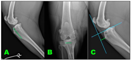 - Millet, M.; Bismuth, C.; Labrunie, A.; Marin, B.; Filleur, A.; Pillard, P.; Sonet, J.; Cachon, T.; Etchepareborde, S. Measurement of the patellar tendon-tibial plateau angle and tuberosity advancement in dogs with cranial cruciate ligament rupture: Reliability of the common tangent and tibial plateau methods of measurement. Vet. Comp. Orthop. Traumatol. 2013, 26, 469–478. [Google Scholar] [CrossRef] [PubMed]