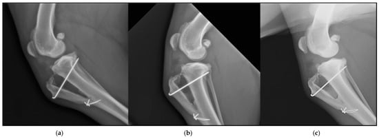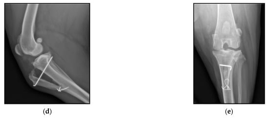 - Danielson, B.; Barnhart, M.; Watson, A.; Kennedy, S.; Naber, S. Short-term radiographic complications and healing assessment of single-session bilateral tibial tuberosity advancements. J. Am. Anim. Hosp. Assoc. 2016, 52, 109–114. [Google Scholar] [CrossRef]