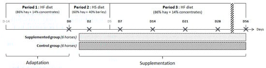 The twelve horses were separated in two homogeneous groups in terms of age and weight (supplemented = group S and control = group C) and enrolled in a longitudinal study of 10 weeks divided into 3 periods, each associated with a diet. Both diets were offered in two equal meals daily (at 08:15 and 16:45). During the first period (2 weeks, day (D) –14 to D0), horses were fed with a HF diet. During the second period (5 days, D0–D5), they were switched abruptly to a HS diet starting at D0 with the afternoon meal. During the third period (7 weeks, D5–D56) they returned to the HF diet without any dietary transition with the afternoon meal at D5 (Figure 1). The HF and HS diets were formulated to be isoenergetic and to meet 100% of the energy requirements for a horse subjected to moderate work [15]. Each horse had free access to a NaCl block and to an automatic waterer. The HF diet was composed of 86% dry matter (DM) of hay and 14% DM of pellet concentrates (Base 3, SERKO, Gemmelaincourt, France). The HS diet was based on 60% DM of hay and 40% DM of rolled barley. HF and HS diets provided 69.5 g and 217.1 g starch/meal/100 kg BW, respectively (Table 1). With the HS diet, starch intake was above the maximum recommendation per meal for hindgut ecosystem health [16], and the daily forage intake was less than the lowest recommended limit [17].
