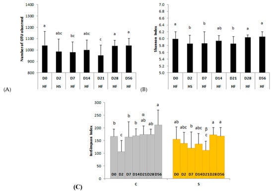 Modifications of the bacterial diversity and richness assessed by (A) the number of observed operational taxonomic units (OTUs), (B) Shannon, and (C) InvSimpson indexes during two consecutive dietary changes from high-fiber (HF) to high-starch (HS) diet and vice versa. On plots (A,B), means with different superscripts differ at p < 0.05 for each day. On plot (C), different Latin superscripts (a, b, c) represent significant variations between days for each supplementation whereas different Greek superscripts (α, β) describe significant variations between supplementations for each day. Error bars are based on standard deviations for each day (D).