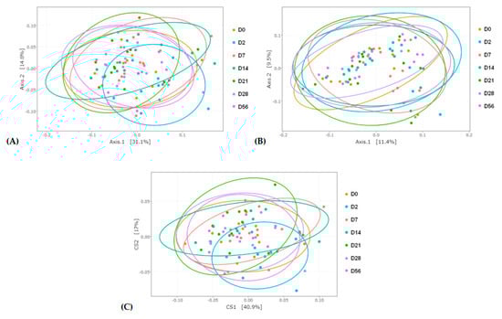 Principle coordinate analysis (PCoA) representing day (D)-related modifications of the bacterial membership and community structure in the feces of horses assessed by (A) weighted and (B) unweighted Unifrac distances. (C) Double PCoA (DPCoA) representing day-related modifications of the bacterial community structure and diversity assessed using abundance and phylogenetic components.