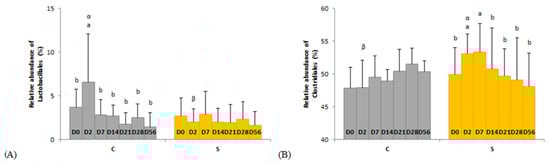 Day × supplementation interactions for two orders: (A) Lactobacillales and (B) Clostridiales. For each plot, different Latin superscripts (a, b) indicate significant variations between days for each supplementation. Different Greek superscripts (α, β) described significant variations between supplementations for each day. The two modalities of supplementation are control (C) and supplemented (S) groups. Error bars are based on standard deviations for each day (D).