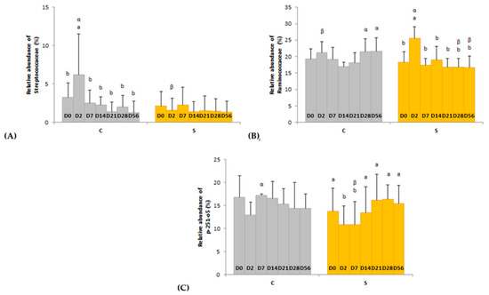 Day × supplementation interactions for three families: (A) Streptococcaceae, (B) Ruminococcaceae and (C) p-251-o5. For each plot, different Latin superscripts (a, b) indicate significant variations between days for each supplementation. Different Greek superscripts (α, β) described significant variations between supplementations for each day. The two modalities of supplementation are control (C) and supplemented (S) groups. Error bars are based on standard deviations for each day (D).