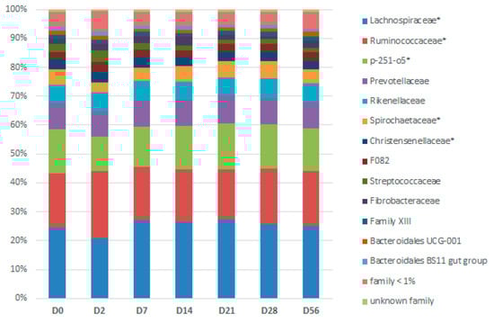 Days (D)-related bacterial modifications at the family level during two consecutive dietary changes from high-fiber (HF) to high-starch (HS) diet and vice versa. The relative abundance of families with star superscripts (*) differed significantly between days.