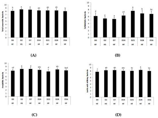 Days–related modifications of the bacterial functional groups’ (A) total anaerobes, (B) cellulolytics, (C) amylolytics, and (D) lactic acid utilizing during two consecutive dietary changes from high-fiber (HF) to high-starch (HS) diet and vice versa. Bacterial concentrations are expressed in log10 colony forming units /g feces. For each plot, means with different superscripts (a, b, c, d) differ at p < 0.05 for each day. Error bars are based on standard deviations for each day (D).