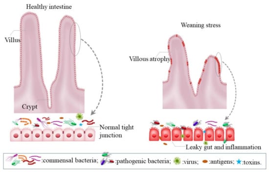 During the weaning process, adverse changes occur in the GI tract, such as villous atrophy, crypt hyperplasia, intestinal inflammation, and increased gut permeability caused by the disruption of tight junctions [17,18,19,20]. A healthy gut harbors a highly diverse community of commensal bacteria and possesses a barrier function that helps to prevent pathogenic microbes from entering the body. However, a decreased microbiota diversity and a leaky gut, caused by weaning stress, would allow pathogenic bacteria, toxins, and harmful antigens to enter the host and cause diseases (Figure 1). These main intestinal characteristics in weaned piglets have recently been reviewed [1,21,22,23] and will not be reiterated here.