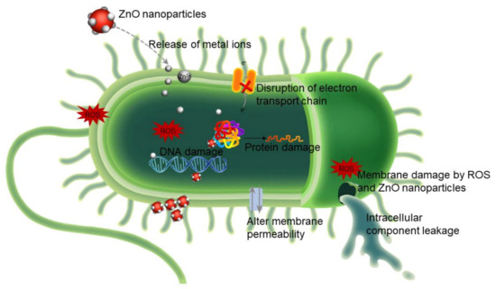 The release of zinc ions in a medium containing ZnO and bacteria plays an important role in the toxic effect of ZnO particles [115]. Metal ions enter bacterial cells, followed by a reduction in ATP levels and disruption to DNA replication.