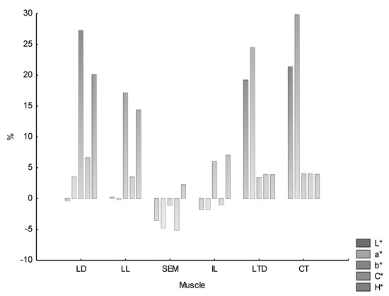 The percentage share of color changes during 30 min bloom time is shown in Figure 2. A percentage increase of color parameters was noted for almost all the muscles (except SEM and partially IL), although to a varying degree. These changes were not homogeneous and were subject to individual variability. However, it should be noted that for LD and LL, the largest growth of changes was observed for parameters b* and H* (between 20–30% for the former muscle and 15–20% for the latter). The percentage decrease in the SEM muscle color value was at a level not exceeding 5%, with the dominant a* and C* parameters. As it was the case for LD and LL muscles, the highest variability of color in the IL muscle was observed for b* and H*, although it exceeded 5% only slightly. A large increase in the proportion of L* and a* was observed for CT muscle (20–30%, the highest of all observed) and LTD (20–25%).
