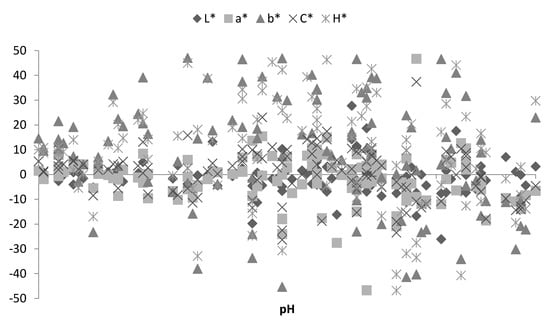 Figure 3 presents the dependence of percentage color change on pH parameters after 30 min bloom time without the division for muscles. A general tendency emerging from individual observations does not indicate any unambiguous dependence in this respect. Therefore, there seems to be no dependency between bloom time effect and the changing muscle pH, nor the interaction of these two main effects. The greatest dispersion was recorded for the b* and H* parameters. On the other hand, the highest stability was observed for the L* and a* parameters.