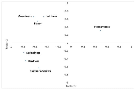 The first principal component (PC1) was softness, and it is characterised by hardness and springiness. A high coefficient is observed for greasiness. This first PC explains 36.83% of the variation observed. The second PC (PC2) is defined by juiciness. A high coefficient is detected for greasiness and number of chews. Greasiness and flavour are equally important for both PCs, and pleasantness has a higher relation with tenderness than with juiciness. This second principal component explains 27.5% of total variation observed. The first two PCs explain 64% of the variance observed.