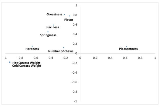 Figure 1 shows plots of the measurements of Rubia de El Molar suckling lambs’ meat quality variates on the first two PCs. Measurements and PCs are interpreted according to the correlations between parameters. Measurements close to each other are positively correlated, measurements separated by 90° are independent, and measurements separated by 180° are negatively correlated. Greasiness, juiciness, and flavour are placed in the loading plot on the top (indicating their importance for the second PCs). These three variates are allocated in a different place than springiness, hardness, and number of chews, that are also grouped on the bottom of the loading plot. These three variates show a negative correlation to greasiness, flavour, and number of chews. Pleasantness is placed in a different allocation on the right of the loading plot. Pleasantness shows a negative correlation to springiness, hardness, and number of chews, and a positive correlation to greasiness, juiciness, and flavour. Pleasantness has a greater importance when defining the first PC than the second PC.