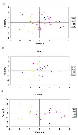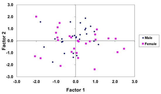 Figure 4 displays the projection of the sensory quality data in the first two PCs for male and female groups. No separated groups can be observed, although males tended to be located in the central area of the plot between females.