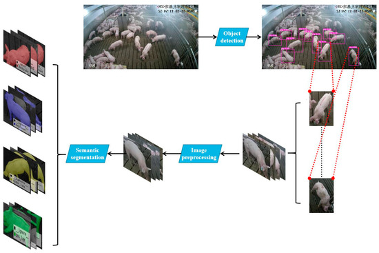To solve the abovementioned problems, this paper proposes a hybrid model that combines object detection and semantic segmentation. First, we used the YOLOv5 object-detection method to extract individual pigs from pig-group pictures, and then, we used the DeepLab v3+ semantic-segmentation method to extract the individual contours of the pigs. The experimental results show that the method proposed in this paper adequately recognizes the postures of pigs in a piggery environment. The overall framework of the method is shown in Figure 1.